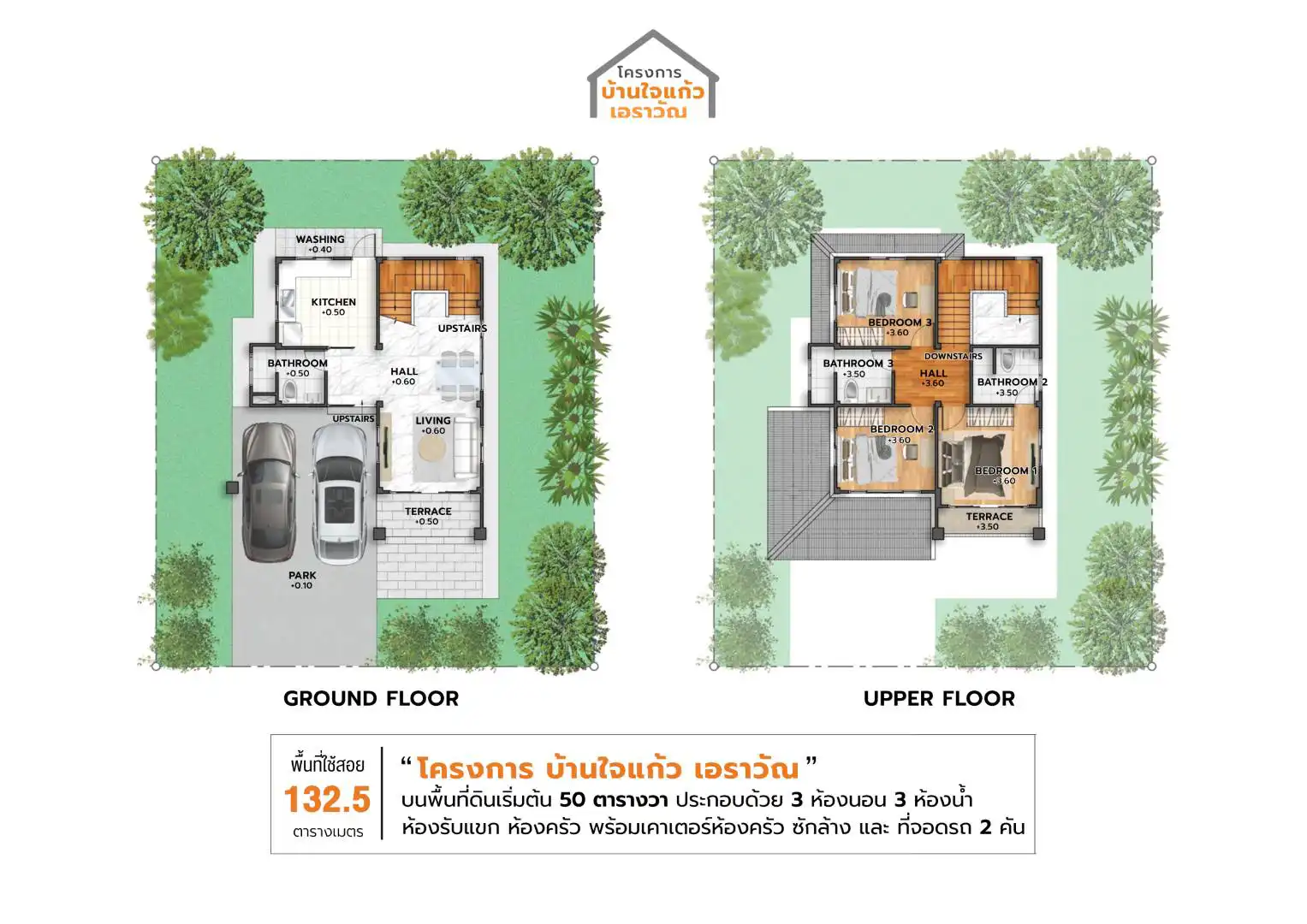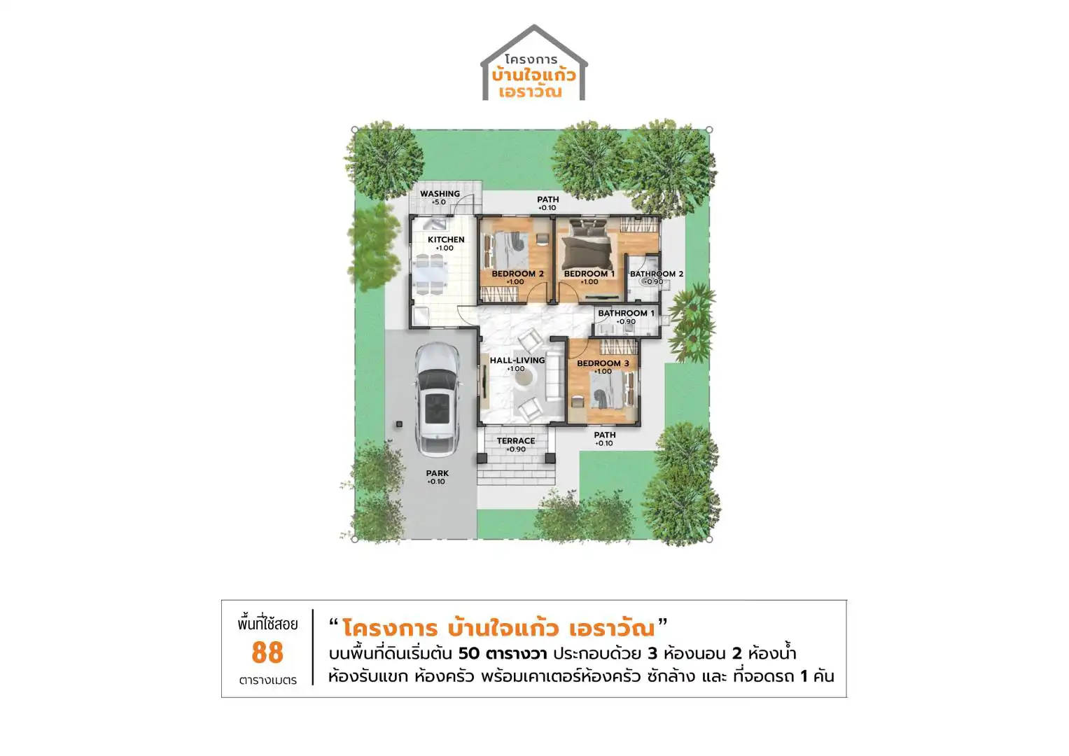 บนพื้นที่ดินเริ่มต้น 50 ตารางวา ประกอบด้วย 3 ห้องนอน 3 ห้องน้ำ โซนรับแขก ห้องครัว พร้อมเคาเตอร์ห้องครัว ซักล้าง และที่ จอดรถ 2 คัน