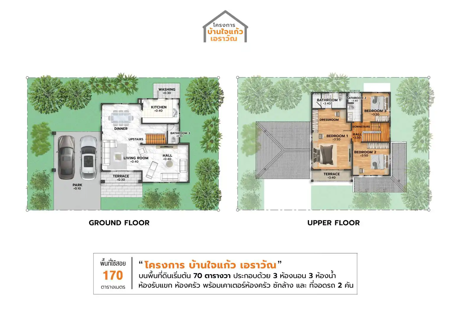 บนพื้นที่ดินเริ่มต้น 70 ตารางวา ประกอบด้วย 3 ห้องนอน 3 ห้องน้ำ โซนรับแขก ห้องครัว พร้อมเคาเตอร์ห้องครัว ซักล้าง และ ที่จอดรถ 2 คัน