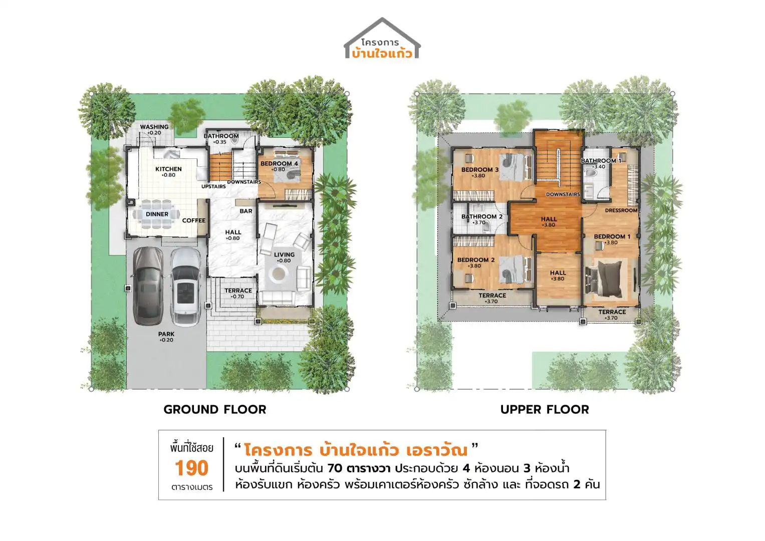 บนพื้นที่ดินเริ่มต้น 70 ตารางวา ประกอบด้วย 4 ห้องนอน 3 ห้องน้ำ โซนรับแขก ห้องครัว พร้อมเคาเตอร์ห้องครัว ซักล้าง และที่จอดรถ 2 คัน
